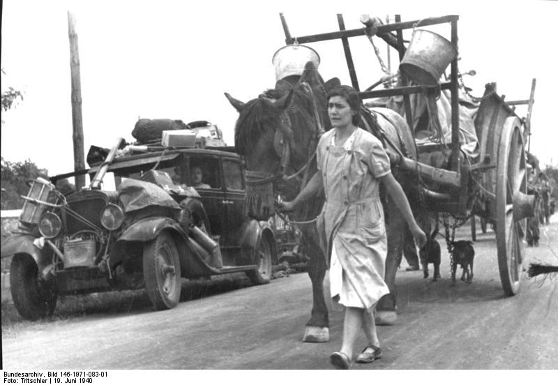 Die Flüchtlingswagen sind hoch beladen mit den wenigen Habseligkeiten. Frankreich, bei Gien. 19.6.1940