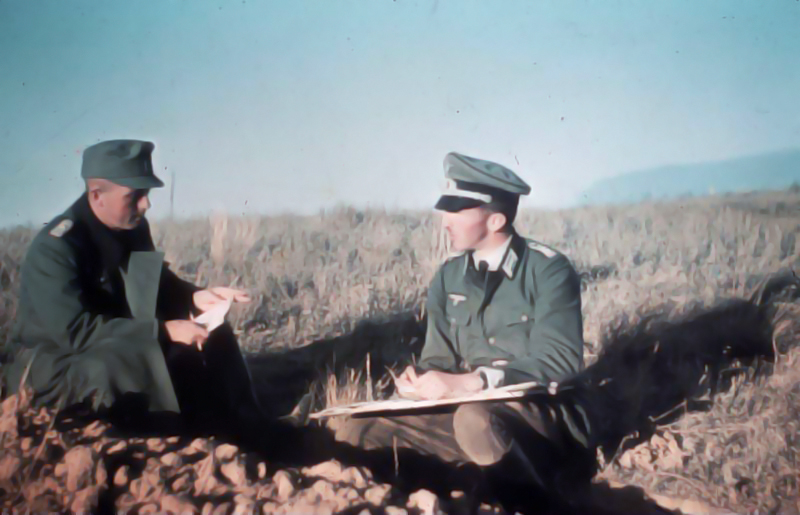 Lagebesprechung in der KalmÑckensteppe vor Stalingrad zwischen dem Kompaniechef und einem ZugfÑhrer