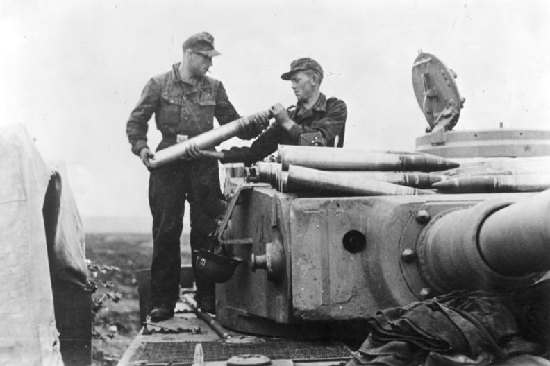 Die Besatzung eines schweren Panzers der deutschen Waffen-SS übernimmt während der Schlacht im Kursker Bogen Granaten vor einem neuen Einsatz im Raum Bjelgorod.