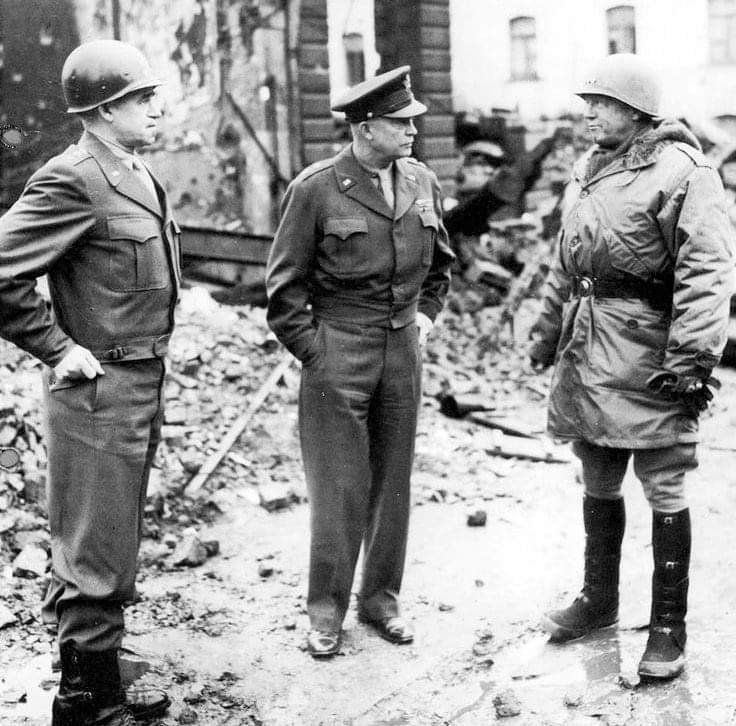 🔝📸🔝📸De izquierda a derecha, General Omar Bradley, General Eisenhower, General George Patton en Bastogne Enero 1945 una vez esta a sido liberada, por la vestimenta queda claro quien está en el campo de Batalla, quien manda más y quien está entre el Cuartel General y el campo de Batalla. 🔥💣🔥💣