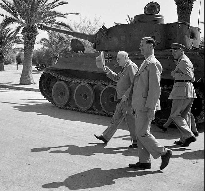 👉Churchill en Tunicia ante un ejemplar de Panzerkampfwagen VI Tiger, posiblemente el número 131 que se encuentra en la actualidad en el Museo del tanque de Bovington UK? Que opináis?💣🔥☠️