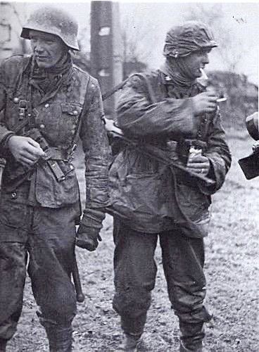 Famosa emboscada de Poteau👉Los Granaderos⚡⚡Panzer Ernst Kalt y Berthold Nasse, del «Kampfgruppe Hansen», 1aDivision Waffen-⚡⚡LSSAH, fuman un cigarrillo después de atacar una columna del 14º Grupo de Caballería Mecanizada de Estados Unidos en Poteau, Bélgica. 18/12/1944.