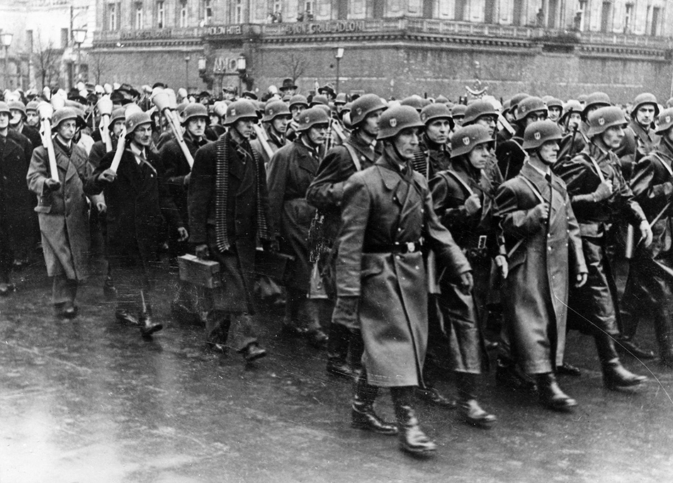 👉Unidades Volkssturm «tormenta del pueblo» desfilando, milicia militar alemana que se movilizó en los últimos meses de la guerra, con una mezcla de material militar, con cascos ⚡⚡y el famoso lanzagranadas Alemán Panzerfaust «Puño de hierro». 🥊💥🥊💥